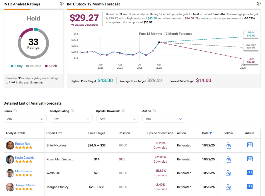 With 25 Holds, six Sells, and two Buy recommendations, Wall Street has a Hold consensus rating on Intel stock. The average INTC stock price target of $29.27 indicates a possible downside of 20.72% from current levels.