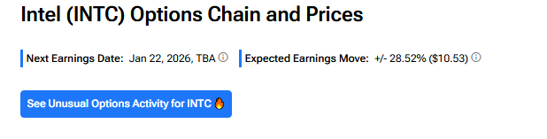 Indeed, it currently says that options traders are expecting about a 28.52% move in either direction in Intel stock in reaction to Q3 results.