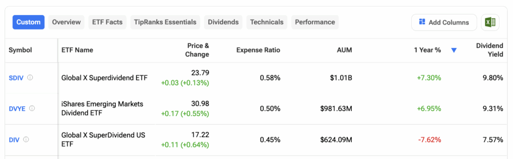 Dividend ETFs remain a favorite among income-seeking investors, but not all are created equal. Using TipRanks’ High Dividend Yield ETFs tool, we have shortlisted three ETFs: Global X Superdividend ETF (SDIV), iShares Emerging Markets Dividend ETF (DVYE), and Global X SuperDividend US ETF (DIV) that offer high dividend yields of over 7%.