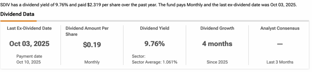 Meanwhile, SDIV pays a monthly dividend of $0.19 per share, reflecting a 9.76% yield, and carries an expense ratio of 0.58%. The ETF holds 100 stocks with total assets of $1.01 billion, with its top 10 holdings accounting for 16.91% of the portfolio.