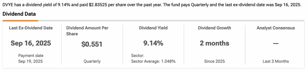 DVYE currently pays a quarterly dividend of $0.551 per share, leading to a 9.14% yield, while maintaining an expense ratio of 0.50%. Meanwhile, DVYE holds 96 stocks with $981.63 million in AUM.