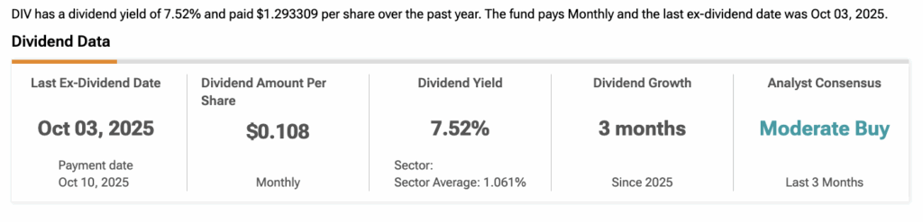 DIV pays a monthly dividend of $0.108 per share, reflecting a yield of 7.52%. Meanwhile, DIV has an expense ratio of 0.45%. In terms of holdings, it has a total of 51 holdings with total assets of $624.09 million.
