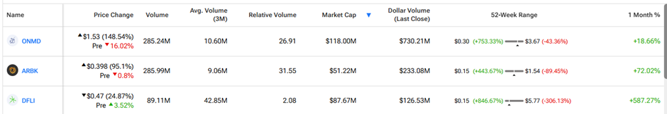 Argo Blockchain (ARBK) – Argo Blockchain is a global data center company that operates large-scale, efficient cryptocurrency mining facilities. Yesterday, ARBK had a Dollar Volume of $233.08 million, accompanied by a stock price surge of 95%.