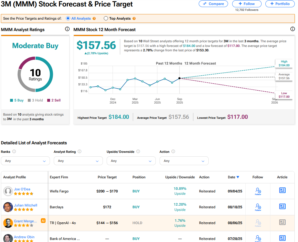 On TipRanks ,MMM has a Moderate Buy consensus based on 5 Buy, 3 Hold and 2 Sell ratings. Its highest price target is $184. MMM stock’s consensus price target is $157.56, implying a 2.78% upside.