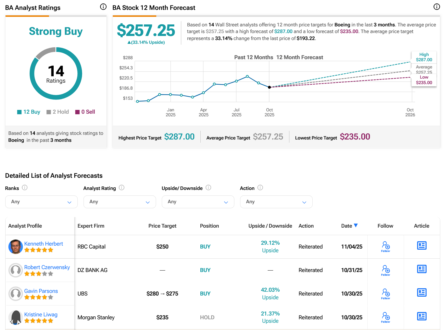 Turning to Wall Street, analysts have a Strong Buy consensus rating on BA stock based on 12 Buys and two Holds assigned in the past three months, as indicated by the graphic below. After a 29.55% rally in its share price over the past year, the average BA price target of $257.25 per share implies 33.14% upside potential.