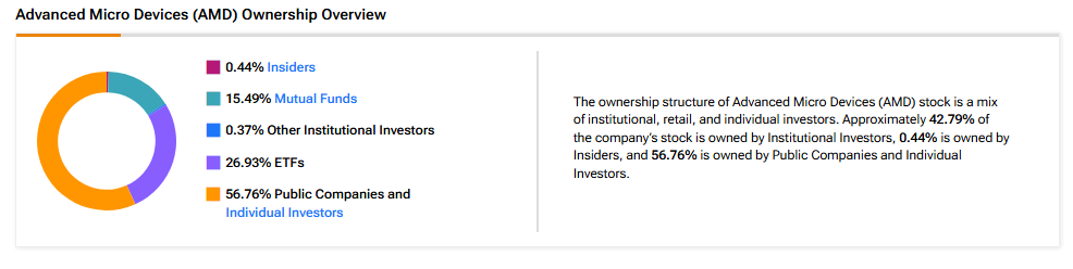 Among the top ETF holders, the Vanguard Total Stock Market ETF (VTI) owns a 3.14% stake in Advanced Micro Devices stock, followed by the Vanguard S&P 500 ETF (VOO), with a 2.50% stake.