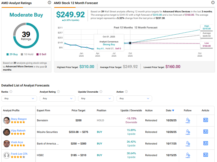 According to TipRanks, AMD stock has a Moderate Buy consensus rating based on 29 Buys and 10 Holds. The average AMD stock price target of $249.92 indicates a possible upside of 5.39% from current levels.