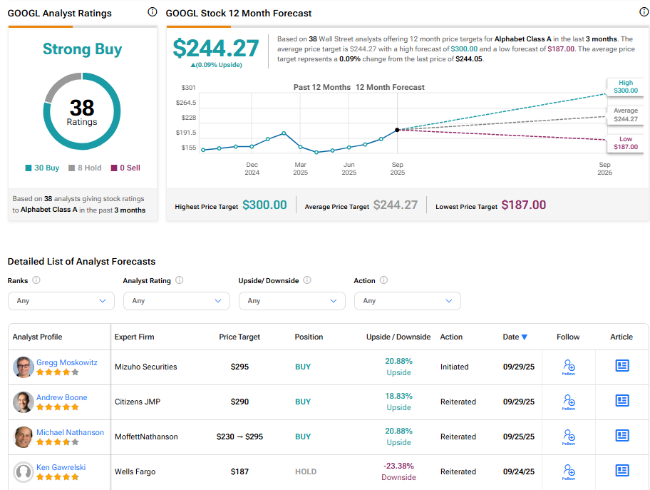 Following Google’s recent acquisition of Wiz, we can turn to Wall Street analysts for their view on the stock. Alphabet holds a Strong Buy consensus rating, with an average GOOGL stock price target of $244.27. This implies a modest 0.09% upside from the current level.
