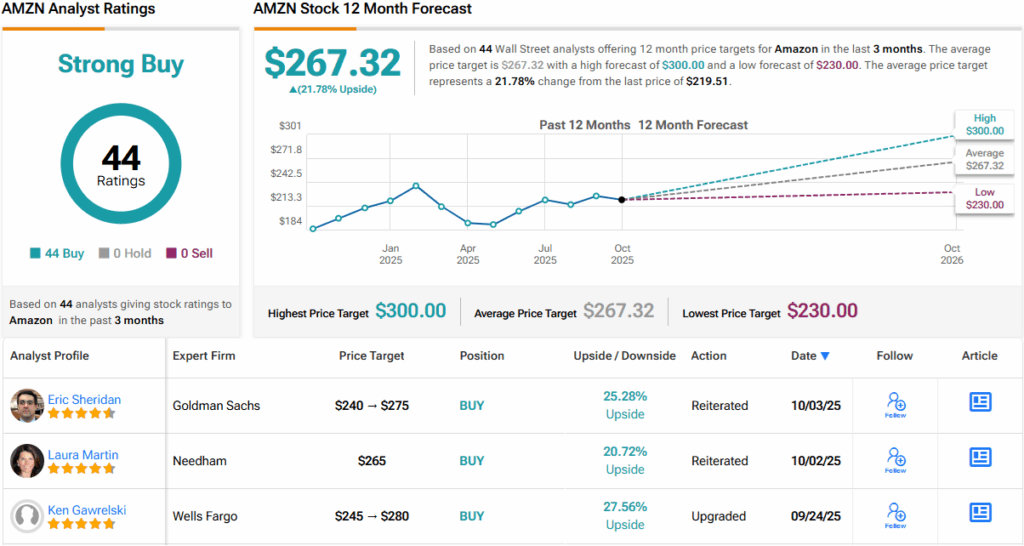 To this end, Walmsley assigns AMZN shares an Outperform (i.e., Buy) rating, along with a $300 price target that points toward a ~37% upside potential in the next 12 months.