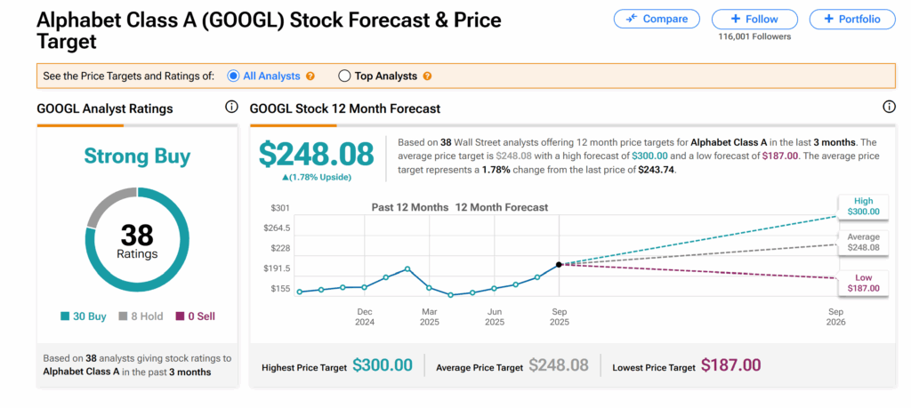 Across Wall Street, Alphabet’s shares currently boast a Strong Buy consensus recommendation, as seen on TipRanks. This is based on 30 Buys and eight Holds assigned by Wall Street analysts over the past three months. However, the average GOOGL price target of $248.08 suggests about 2% downside risk.