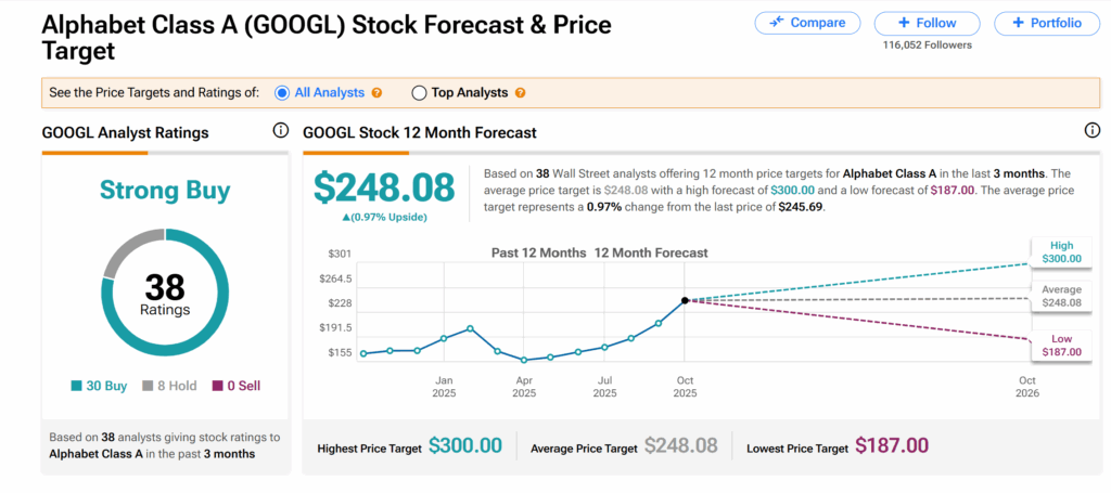 Across Wall Street, Alphabet’s shares currently boast a Strong Buy consensus recommendation, as seen on TipRanks. This is based on 30 Buys and eight Holds assigned by Wall Street analysts over the past three months. However, the average GOOGL price target of $248.08 suggests about 1% downside risk.