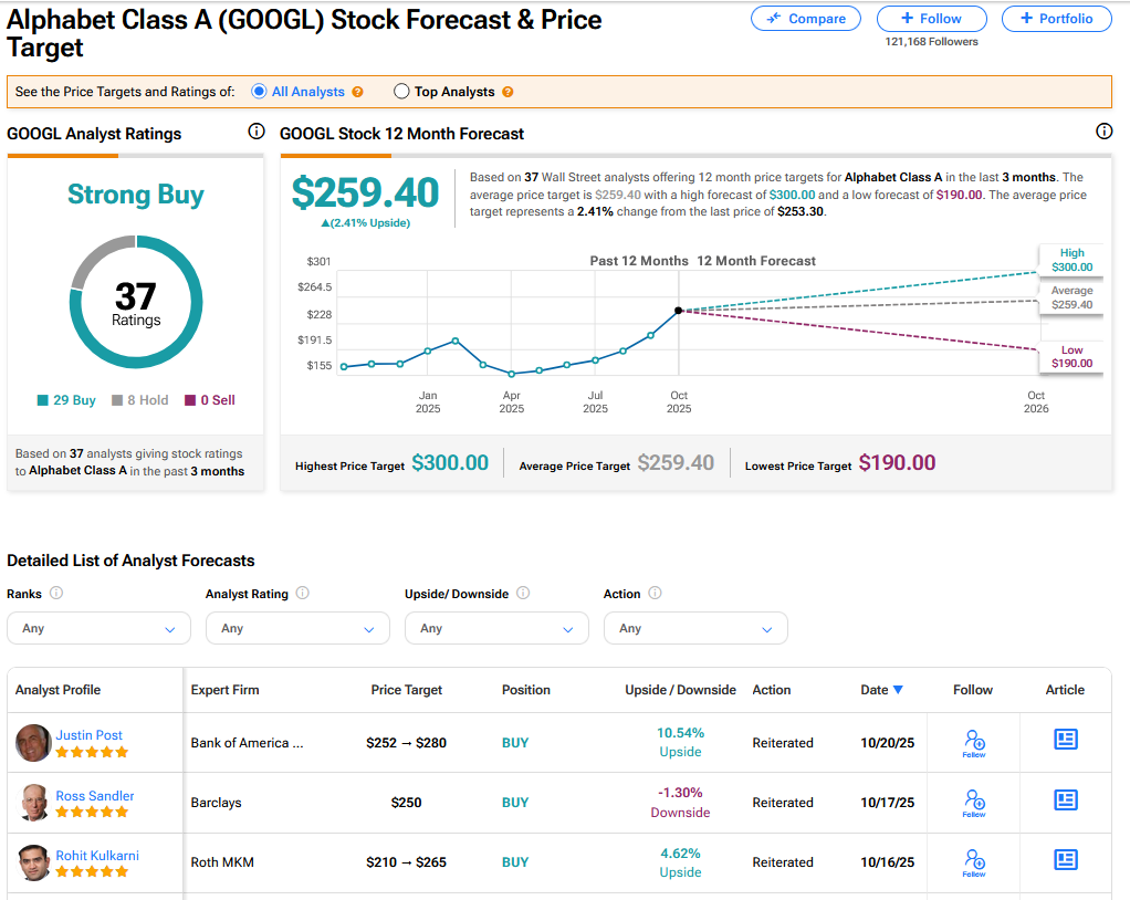 On TipRanks, GOOGL has a Strong Buy consensus based on 29 Buy and 8 Hold ratings. Its highest price target is $300. GOOGL stock’s consensus price target is $259.40, implying a 2.41% upside.
