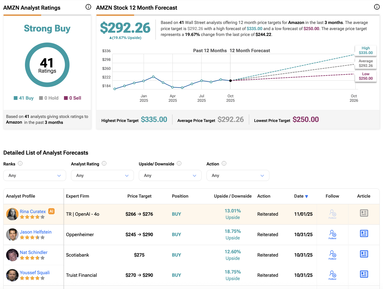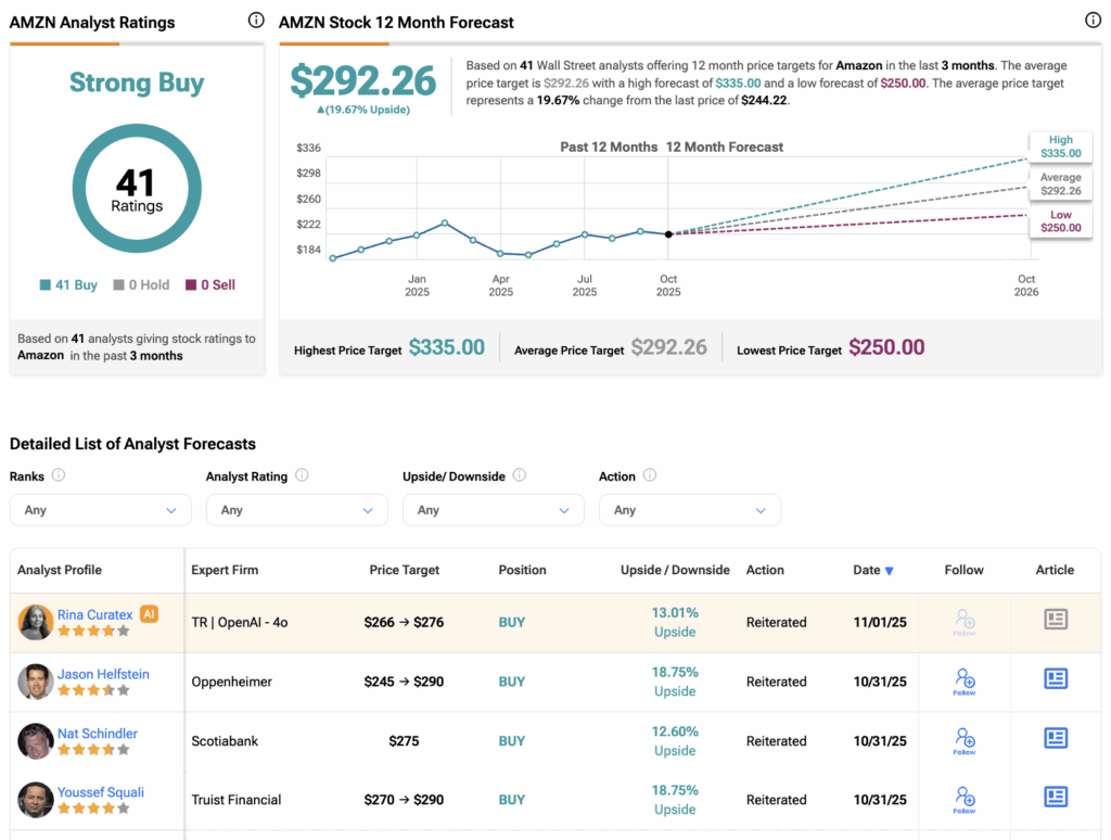 Likewise, top-rated analyst Thomas Champion at Piper Sandler also lifted his price target to $300. Champion pointed out Amazon Web Services (AWS) revenues, which grew 20% year over year, supported by new power capacity that’s expected to double again by 2027. He added that Amazon continues to focus on cutting costs and is likely entering a new AI-driven product cycle.