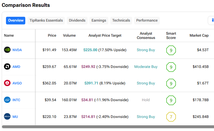 Broadcom also carries a Strong Buy rating, with roughly 8% upside, while Micron is rated Strong Buy but shows a small 2% downside. Meanwhile, AMD holds a Moderate Buy rating and a 3.7% downside, and Intel remains a Hold with a 12% downside.