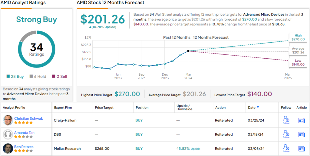 Overall, Wall Street gives AMD shares a Strong Buy consensus rating, based on 34 analyst reviews that include 28 Buys and 6 Holds. The stock is selling for $181.43 and its $201.26 average price target suggests it will appreciate by ~11% in the next 12 months. (See AMD stock forecast)