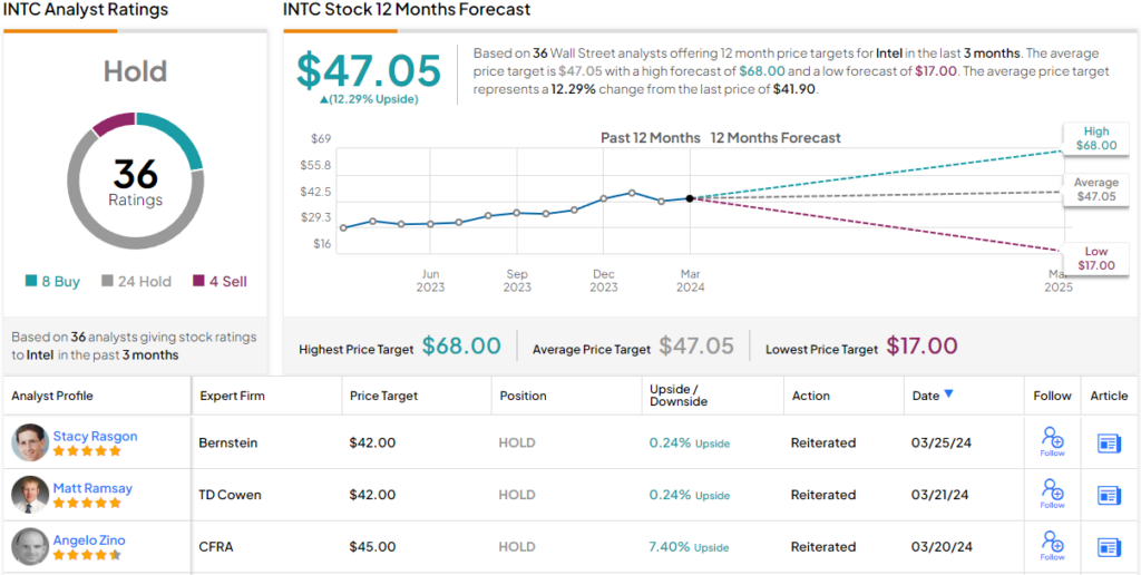O’Malley goes on to put an Equal Weight (i.e. Neutral) rating on shares of INTC, and he gives the stock a $44 price target, suggesting just 5% upside for the next 12 months.