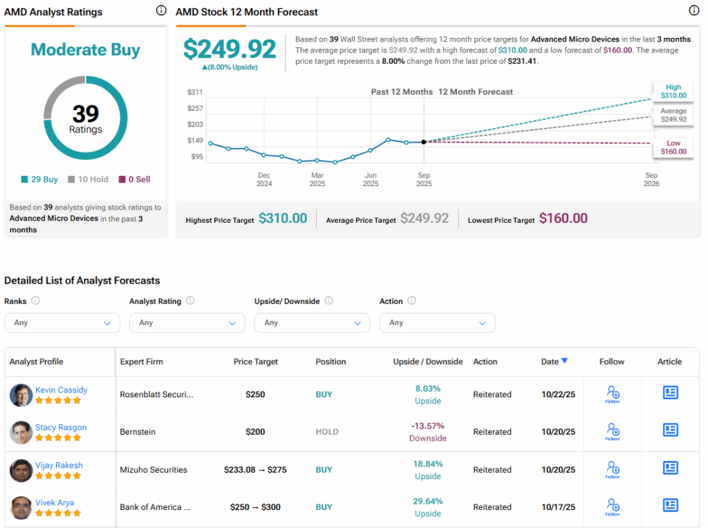 Turning to Wall Street, the analysts’ consensus rating for AMD is Moderate Buy, based on 29 Buy and 10 Hold ratings over the past three months. With that comes an average AMD stock price target of $249.92, representing a potential 8% upside for the shares.