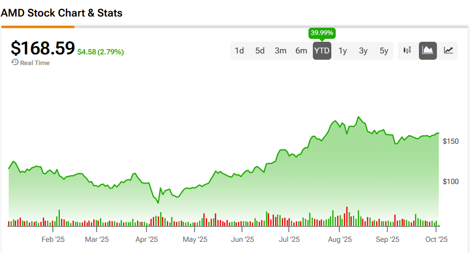 AMD stock was up 2.79% on Thursday, extending a 39.99% year-to-date rally. The chipmaker’s shares have also increased 0.71% over the past 12 months. Much of these gains are related to the AI boom, though AMD has also performed well in the consumer PC parts market in 2025.