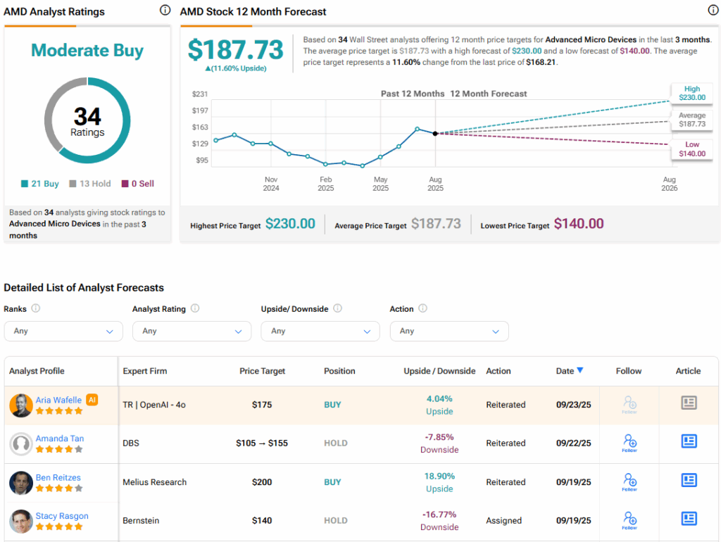 Turning to Wall Street, the analysts’ consensus rating for AMD is Moderate Buy, based on 21 Buy and 13 Hold ratings over the past three months. With that comes an average AMD stock price target of $187.73, representing a potential 11.6% upside for the shares.