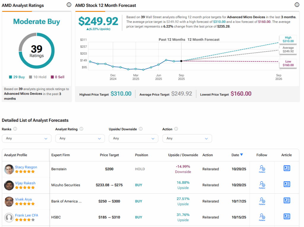 Turning to Wall Street, the analysts’ consensus rating for AMD is Moderate Buy, based on 29 Buy and 10 Hold ratings over the past three months. With that comes an average AMD stock price target of $249.92, representing a potential 6.22% upside for the shares.