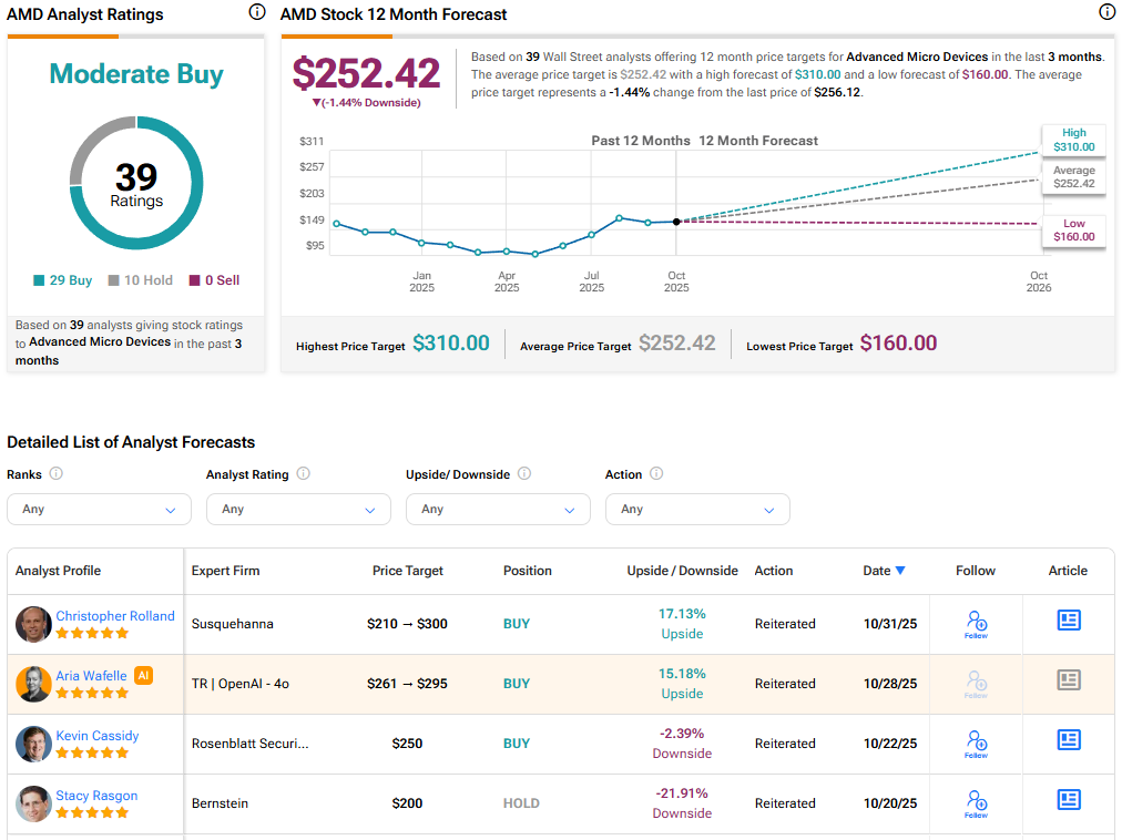 Overall, Wall Street has a Moderate Buy consensus rating on Advanced Micro Devices stock based on 29 Buys and 10 Holds. The average AMD stock price target of $252.42 indicates a possible downside of 1.4% from current levels.