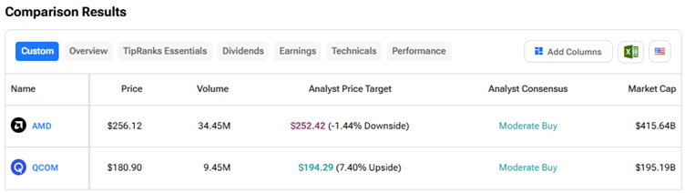 Chip stocks are in focus, thanks to the massive demand created by the artificial intelligence (AI) boom. While Nvidia (NVDA) remains the dominant player in the AI chip market, competition from other chip companies, such as Advanced Micro Devices (AMD) and Broadcom (AVGO), is rising. All eyes are now on the upcoming earnings reports from AMD and Qualcomm (QCOM), with investors awaiting more details on their AI roadmaps. Using TipRanks’ Stock Comparison Tool, we placed AMD and Qualcomm against each other to find the best chip stock, according to Wall Street analysts.
