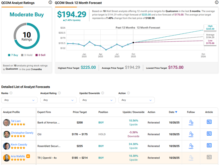 Currently, Wall Street has a Moderate Buy consensus rating on Qualcomm stock based on seven Buys and three Holds. At $194.29, the average QCOM stock price target indicates 7.4% upside potential.