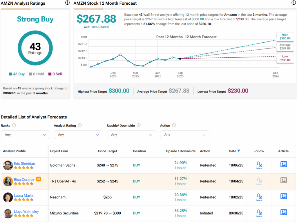 Turning to Wall Street, analysts have a Strong Buy consensus rating on Amazon stock based on 43 Buys assigned in the past three months. Furthermore, the average AMZN stock price target of $267.88 per share implies 21.7% upside potential from current levels.