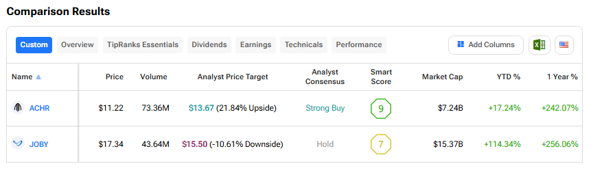 Using TipRanks’ Stock Comparison Tool, we compared Archer and Joby Aviation to see which air taxi stock analysts currently favor. Archer stands out with a Strong Buy rating and a Smart Score of 9, while Joby holds a Hold rating and a Smart Score of 7.