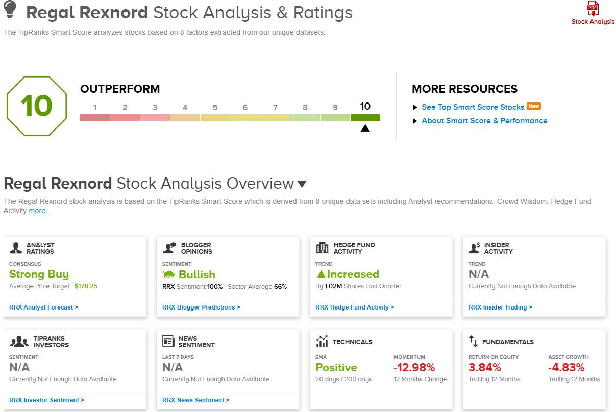 The first ‘Perfect 10’ stock on our radar here is Regal Rexnord, a stalwart of the industrial sector with 70 years’ experience in designing, manufacturing, and marketing the specialized tools and products that support power and transmission assemblies for moving systems. In simpler language, Regal Rexnord focuses on motion control. The company’s product lines include AC/DC controls and drives, mechanical power transmission components, gearings, industrial chain and sprocket assemblies, electric motors and components, clutches and brakes – it’s a long list, as motion control forms a vital niche in the modern industrial plant.