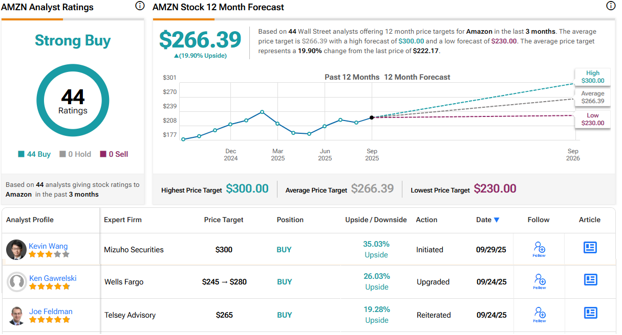 So, what does this all ultimately mean for investors? Walmsley initiated coverage of AMZN with an Outperform (i.e., Buy) rating, backed by a $300 price target. There’s potential upside of 35% from current levels. (To watch Walmsley’s track record, click here)