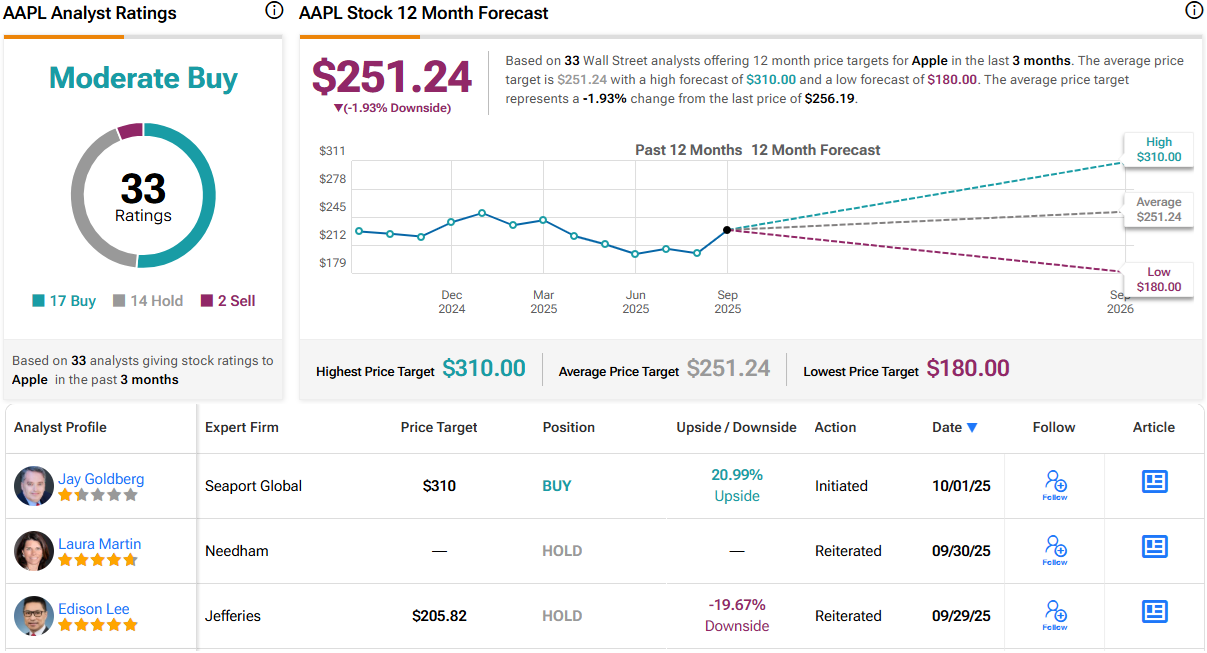 Of the 33 AAPL reviews posted over the past 3 months, 17 say Buy, 14 recommend to Hold, while 2 implore to Sell, all adding up to a Moderate Buy consensus rating. However, the average target stands at $251.24, suggesting the shares will stay rangebound for the time being. (See Apple stock forecast)