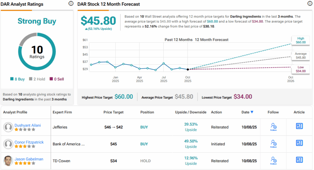 Overall, Darling’s stock has a Strong Buy consensus rating on the Street, based on 10 reviews that include 8 to Buy and 2 to Sell. The stock is priced at $30.10, and its $45.80 average target price implies a gain of 52% in the next 12 months. (See DAR stock forecast)