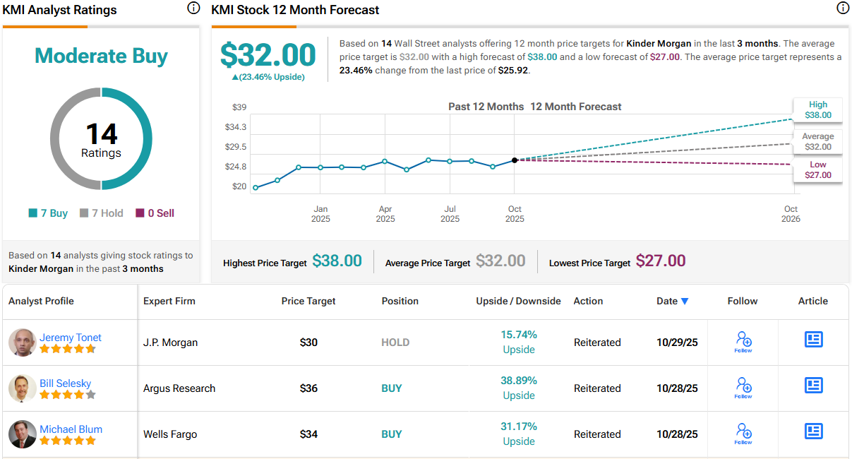 Overall, Kinder Morgan’s stock holds a Moderate Buy consensus rating from the Street’s analysts, based on 14 recent reviews that split evenly between 7 Buys and 7 Holds. The stock is currently priced at $25.92 and its $32 average price target is slightly more bullish than the Goldman view, implying a 23.5% gain over the next 12 months. (See KMI stock forecast)