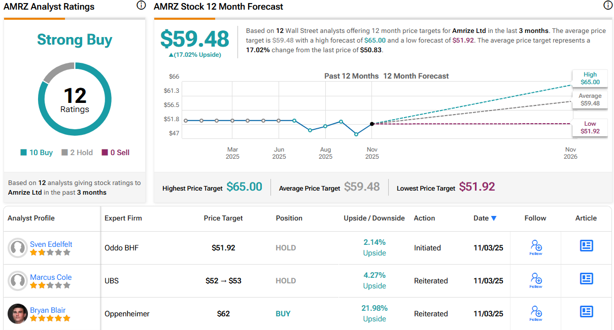 The 12 recent reviews on record for Amrize include 10 Buys and 2 Holds, for a Strong Buy consensus rating. The stock’s $50.83 trading price and $59.48 average price target together suggest a potential one-year upside of 17%. (See AMRZ stock forecast)