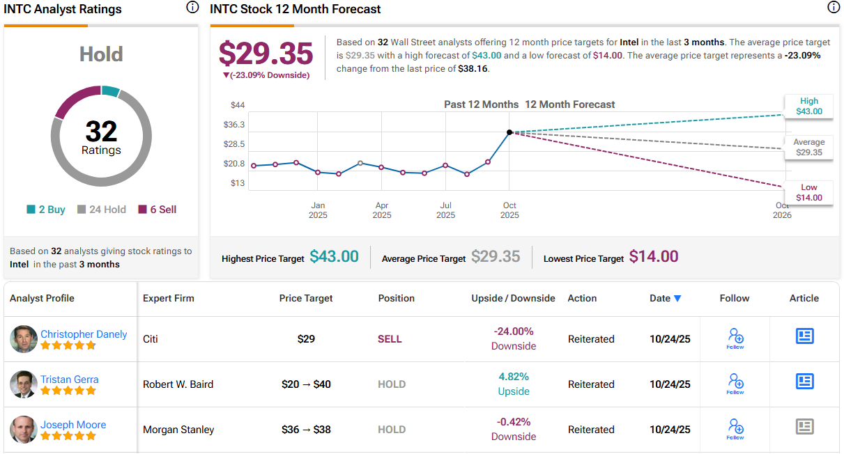 The Street, as a whole, does have one, and it concludes the shares are overvalued; at $29.35, the figure sits 23% below the current share price. Most analysts are also sitting this one out for now; the stock’s Hold consensus rating is based on 24 Holds, 6 Sells and 2 Buys. (See Intel stock forecast)