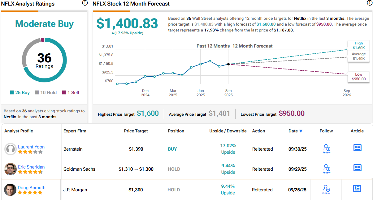 That target is only slightly lower than the Street’s average, which stands at $1,400.83 and factors in a one-year gain of 18%. On the rating front, the stock claims a Moderate Buy consensus view, based on a mix of 25 Buys, 10 Holds and 1 Sell. (See Netflix stock forecast)