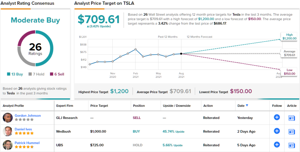 Ive is one of the Street’s most fervent Tesla bulls, and his colleagues’ average price target is a far more modest $709.61, suggesting shares will barely move over the next 12 months. As usual, this stock generates a wide range of opinions on Wall Street; based on 13 Buys, 7 Holds and 6 Sells, the analyst consensus rates Tesla a Moderate Buy. (See TSLA stock analysis on TipRanks)