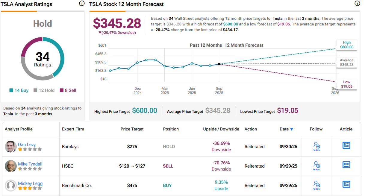 Turning now to the rest of the Street, where Gianarikas’ overall bullish stance gets the backing of 13 other analysts yet with an additional 12 Holds and 8 Sells, the analyst consensus rates the stock a Hold. Most also think the shares have overshot; at $345.28, the average target factors in a one-year slide of 20.5%. (See Tesla stock forecast)