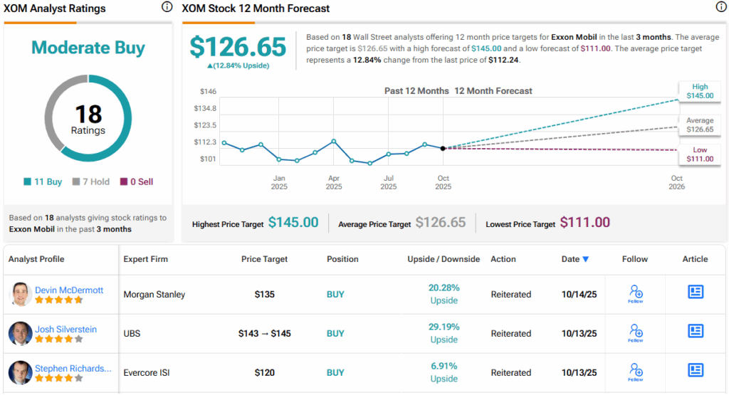 The Moderate Buy consensus rating on ExxonMobil is based on 18 analyst reviews, which break down to 11 Buys and 7 Holds. The stock is currently trading for $112.24 and has an average target price of $126.65; together, these suggest a 13% upside over the next 12 months. (See XOM stock forecast.)