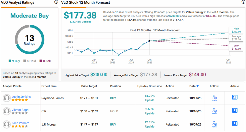 Overall, Valero is another stock with a Moderate Buy from the analyst consensus, this one based on 13 recent reviews that include 9 Buys and 4 Holds. The shares are priced at $157.77, and their $177.38 average target price indicates room for an upside of 12.5% in the coming year. (See VLO stock forecast.)