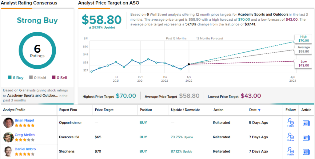 That’s a bullish outlook, but it’s no outlier. ASO shares have picked up a unanimous 6 Buy ratings in recent weeks, for a Strong Buy consensus view. The shares are selling for $37.36, and their $58.80 average price target implies a one-year upside of ~57%. (See ASO stock forecast on TipRanks)