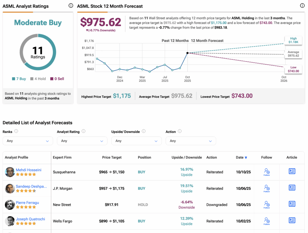 On TipRanks, ASML stock has a Moderate Buy consensus rating based on seven Buys and four Hold ratings. The average ASML price target of $975.62 implies a 0.77% downside from current levels.