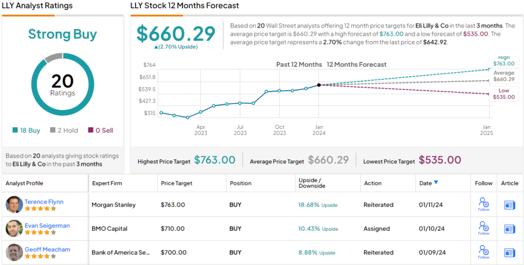 And what about the rest of the Street? Most are also backing LLY’s case. With an additional 17 Buys outnumbering 2 Holds, the analyst consensus rates the stock a Strong Buy. That said, the $660.29 average price target, makes room for only modest returns of ~3%. (See LLY stock forecast)