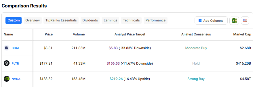 Massive spending commitments by many hyperscalers and other companies and multiple deals announced recently by tech giants like Nvidia (NVDA) and Advanced Micro Devices (AMD) continue to sustain investors’ focus on artificial intelligence (AI) stocks. However, not all companies are able to capture AI-led demand to the same extent and justify their valuations, raising concerns about an AI bubble. Given this backdrop, we used TipRanks’ Stock Comparison Tool to place BigBear.ai Holdings (BBAI), Palantir Technologies (PLTR), and Nvidia against each other to find the best AI stock, according to Wall Street.