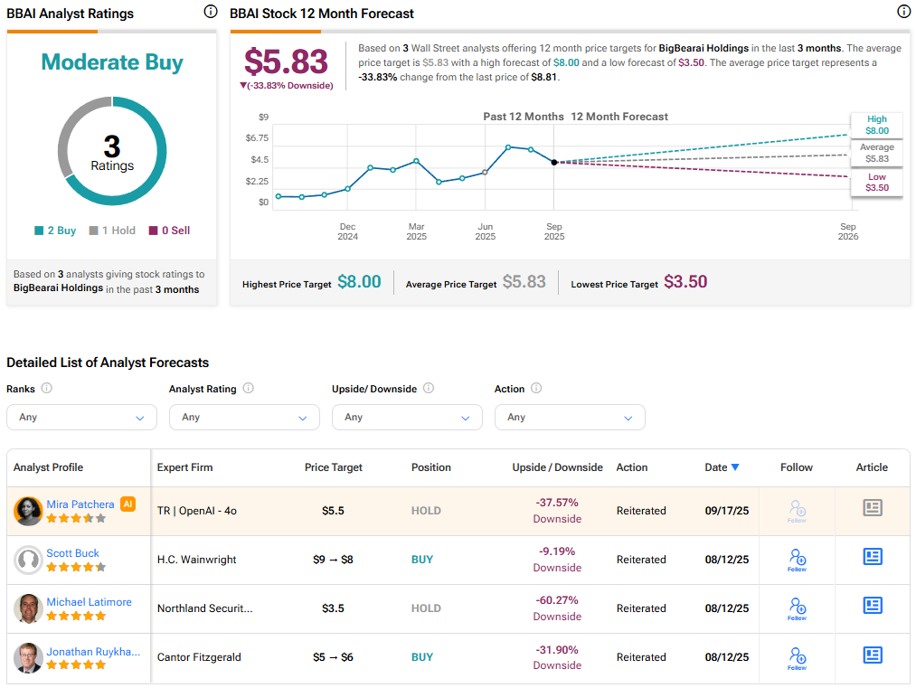 With two Buys and one Hold recommendation, Wall Street has a Moderate Buy consensus rating on BigBear.ai stock. The average BBAI stock price target of $5.83 indicates a downside risk of 33.8% from current levels.