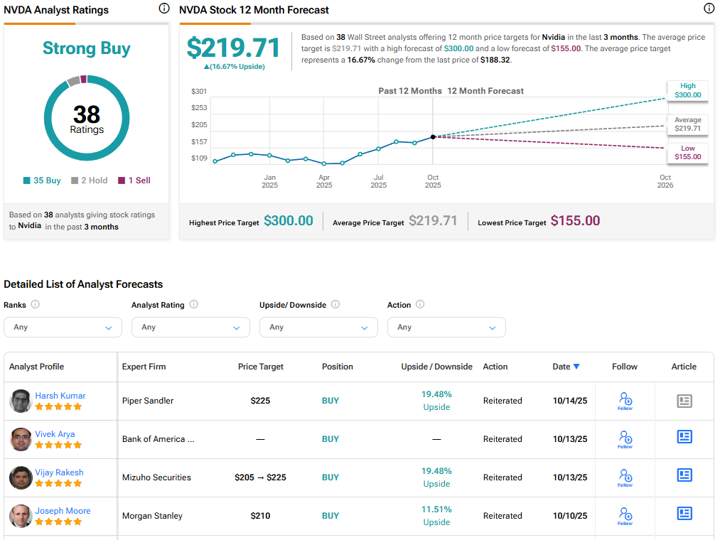 Overall, Wall Street has a Strong Buy consensus rating on Nvidia stock based on 35 Buys, two Holds, and one Sell recommendation. The average NVDA stock price target of $219.71 indicates about 17% upside potential from current levels. Nvidia stock has risen more than 40% year-to-date.