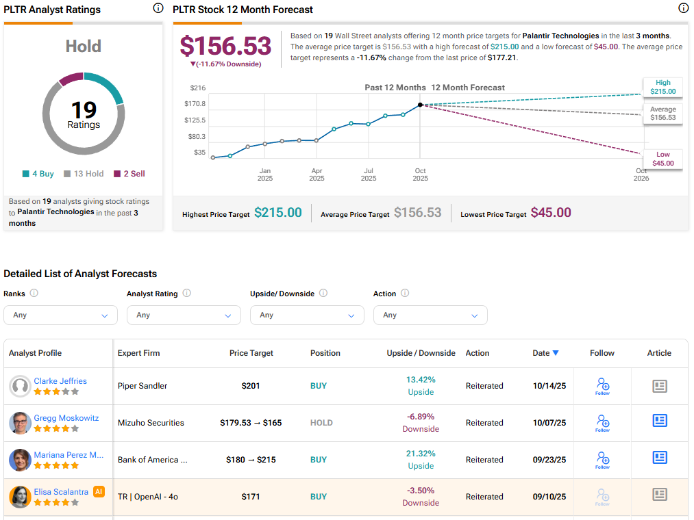 Currently, Wall Street has a Hold consensus rating on Palantir Technologies stock based on 13 Holds, four Buys, and two Sell recommendations. At $156.53, the average PLTR stock price target indicates a possible downside of about 12%.
