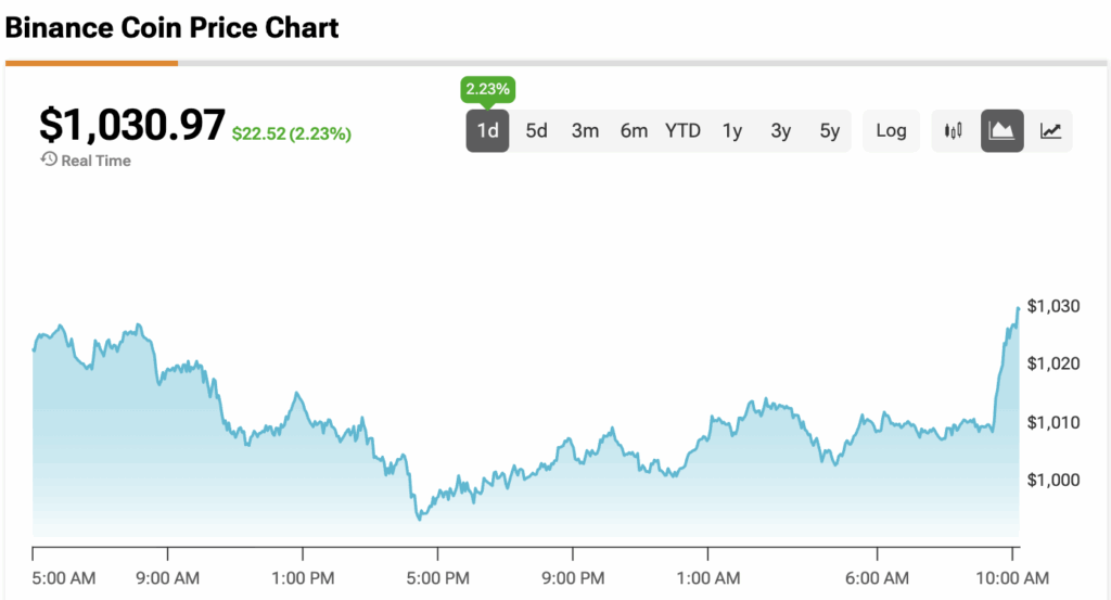 Despite the news, BNB coin is up 2% in the past 24 hours. At the time of writing, BNB is sitting at $1,030.97.