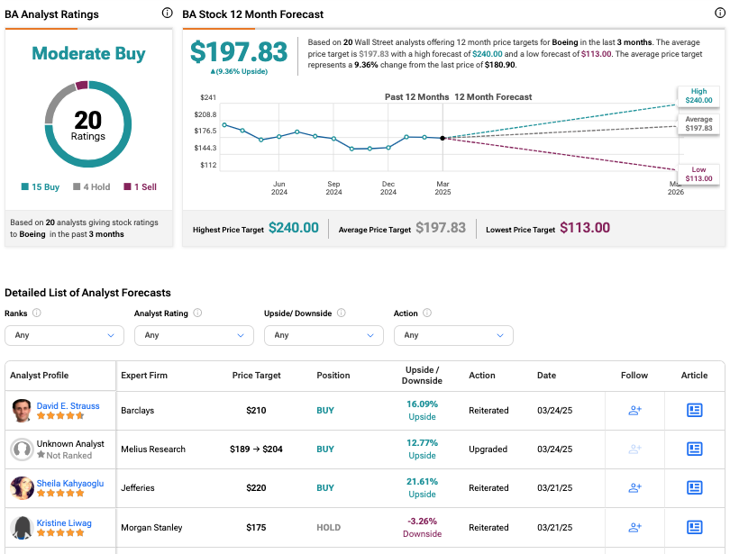 Amid all the legal drama, analysts have a Moderate Buy consensus rating on BA stock based on 15 Buys, four Holds, and one Sell assigned in the past three months. Meanwhile, the average Boeing share price target of $197.83 per share implies a 9.4% upside potential.